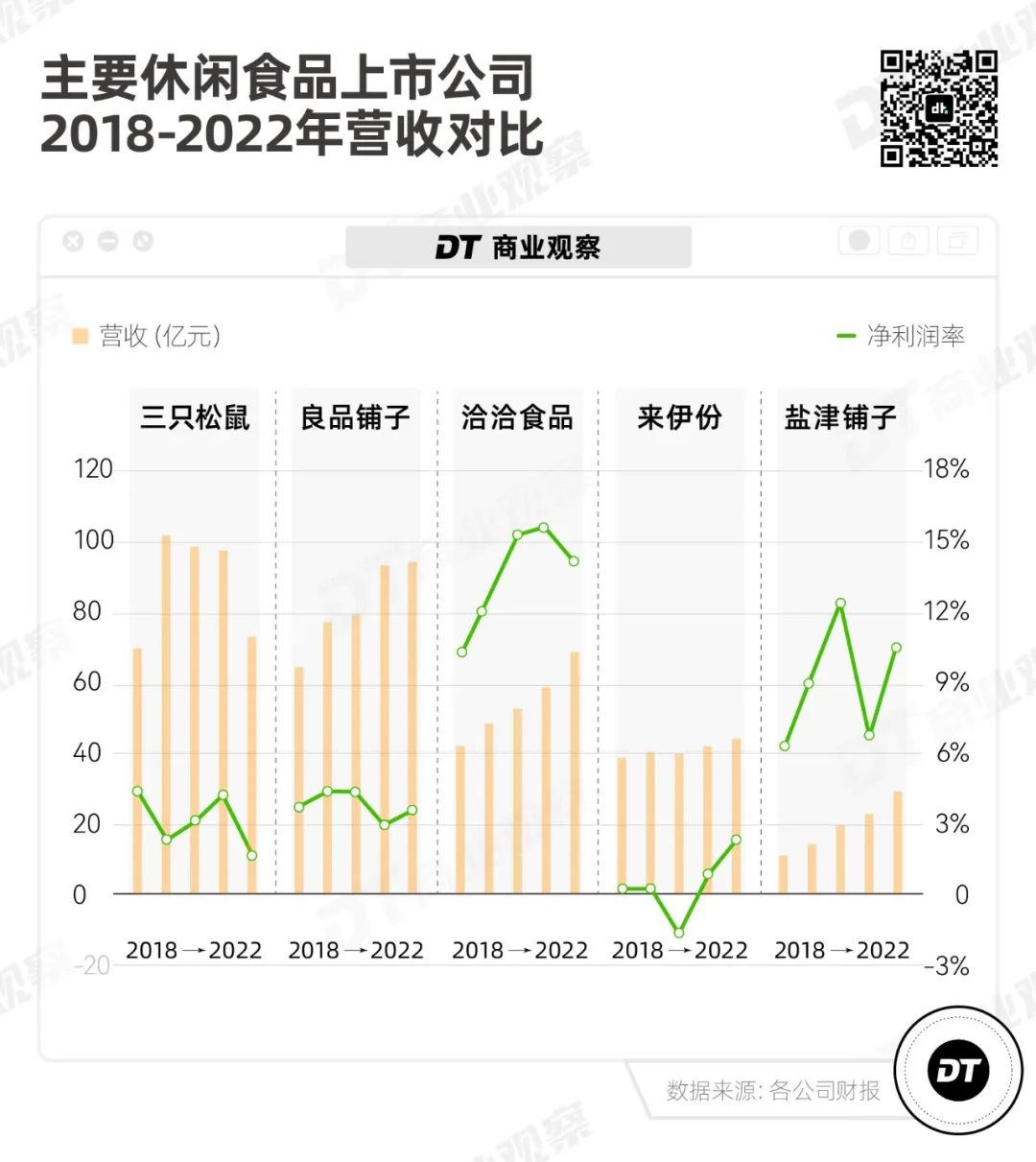 對比國內(nèi)主要上市休閑食品公司,2022年,良品鋪子營收比洽洽食品高,但利潤率幾乎只有洽洽的四分之一。