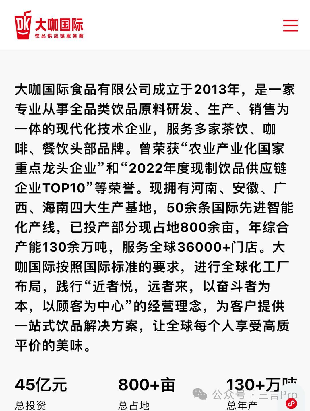據(jù)大咖國際官網(wǎng)介紹,大咖國際食品有限公司成立于2013年,是一家專業(yè)從事全品類飲品原料研發(fā)、生產、銷售為一體的現(xiàn)代化技術企業(yè),服務多家茶飲、咖啡、餐飲頭部品牌,F(xiàn)擁有河南、安徽、廣西、海南四大生產基地。