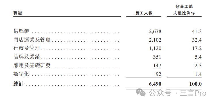 按職能劃分,供應鏈員工人數(shù)為2678人,占比41.3%;門店運營及管理員工人數(shù)為2102人,占比32.4%;行政及管理員工數(shù)為1120人,占比17.2%;品牌及影響員工數(shù)為351人,占比5.4%;應用及基礎研發(fā)員工數(shù)為147人,占比2.3%;數(shù)字化員工數(shù)為92人,占比1.4%。