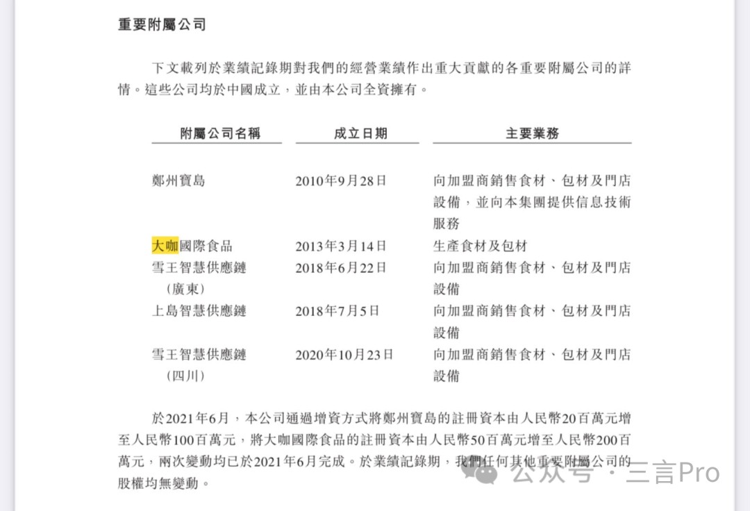 蜜雪冰城的招股書里,還披露了一個名叫大咖國際食品的附屬公司,主要業(yè)務是生產食材及包材。