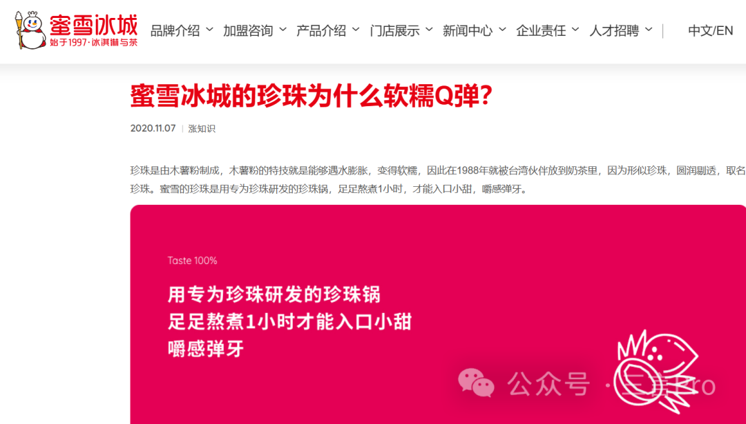 據(jù)蜜雪冰城官網(wǎng)介紹,珍珠是由木薯粉制成,木薯粉的特技就是能夠遇水膨脹,變得軟糯,因此在1988年就被臺灣伙伴放到奶茶里,因為形似珍珠,圓潤剔透,取名珍珠。蜜雪的珍珠是用專為珍珠研發(fā)的珍珠鍋,足足熬煮1小時,才能入口小甜,嚼感彈牙。
