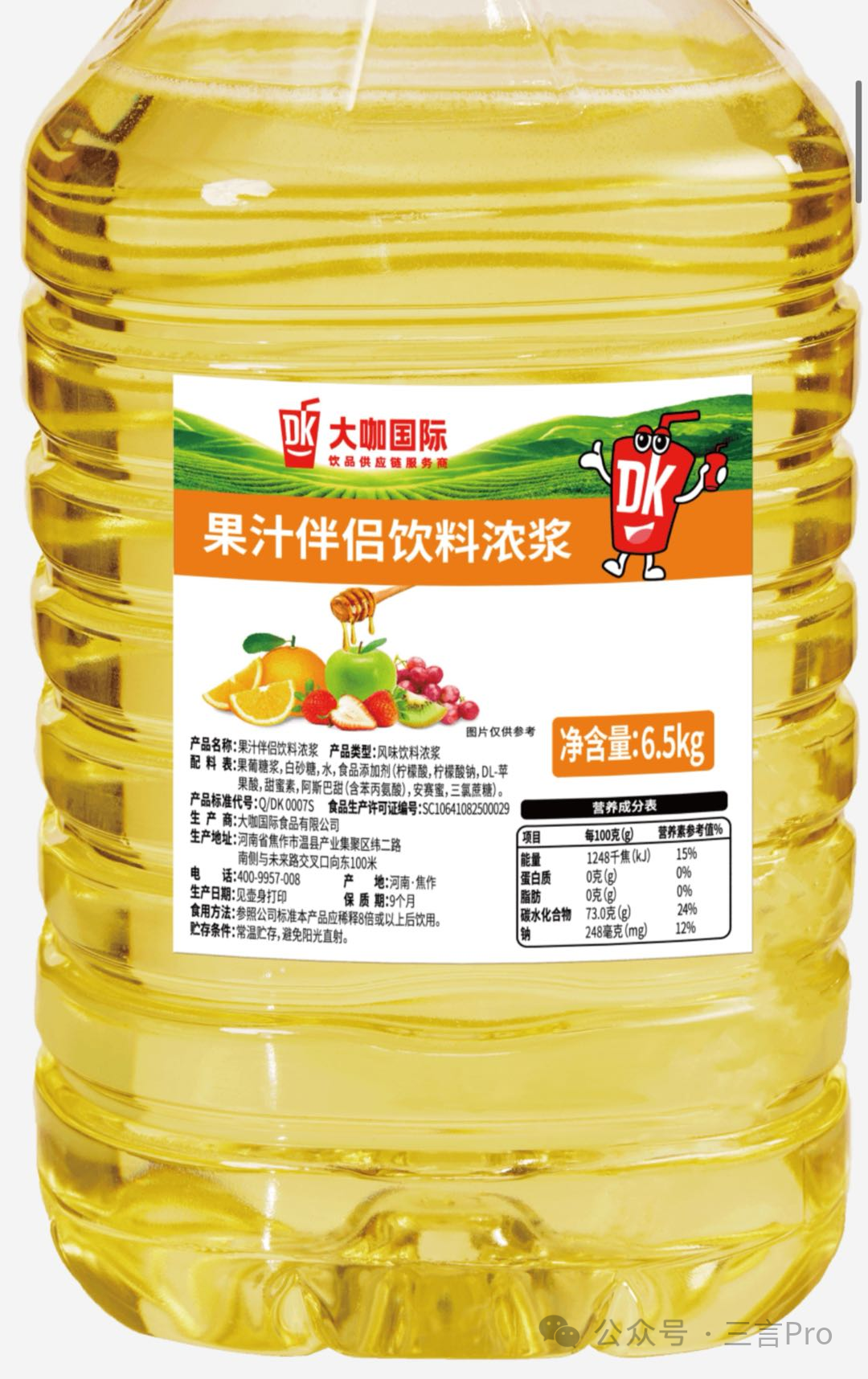 從大咖國際的產品配料表來看,其生產的蔗糖風味飲料濃漿,配料表中的食品添加劑包含檸檬酸、檸檬酸鈉、山梨酸鉀和甜蜜素。