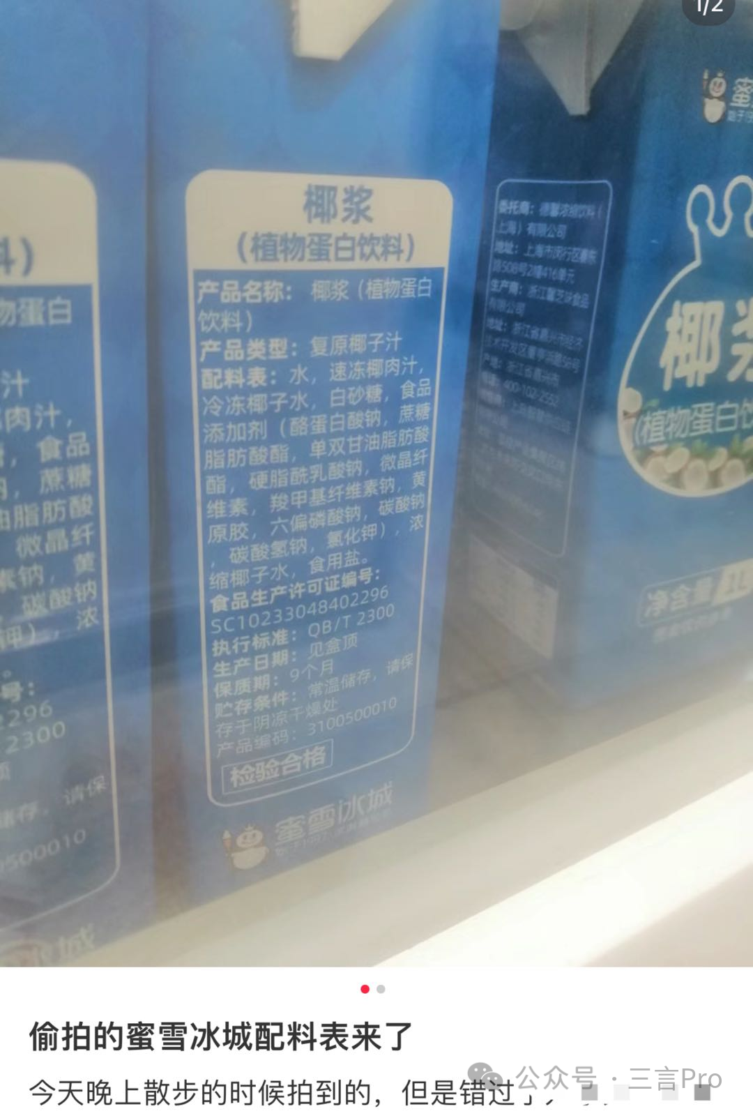 有網(wǎng)友分享了蜜雪冰城所用椰漿的配料表,包含酪蛋白酸鈉、庶糖脂肪酸酯、單雙甘油脂肪酸酯、硬脂酰乳酸鈉、微晶纖維素、羧甲基纖維素鈉、黃原膠、六偏磷酸鈉、碳酸鈉、碳酸氫鈉、氯化鉀等多種食品添加劑。