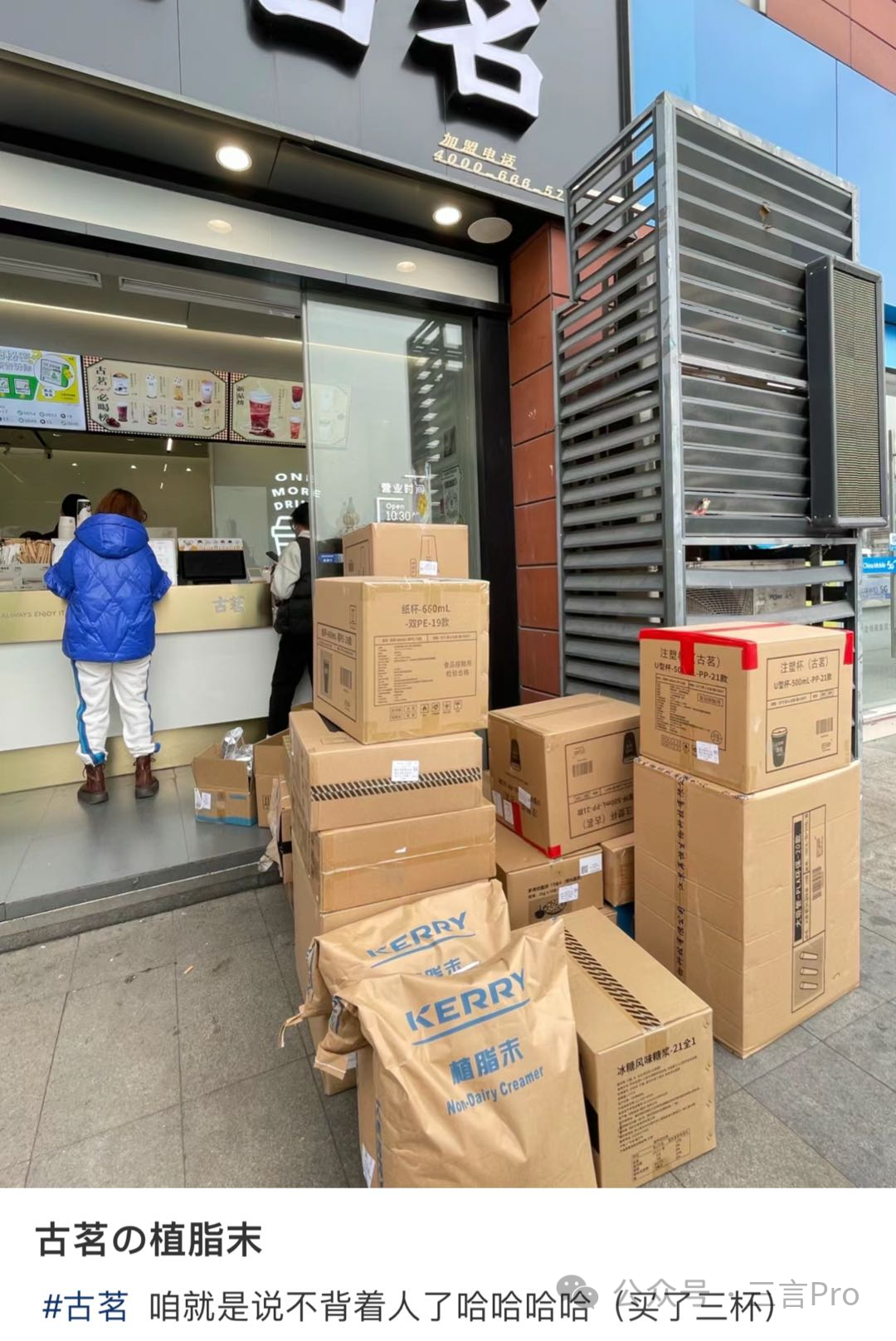 有網(wǎng)友分享的照片顯示,古茗的食材里,有調味糖漿、植脂末等原料的箱子。