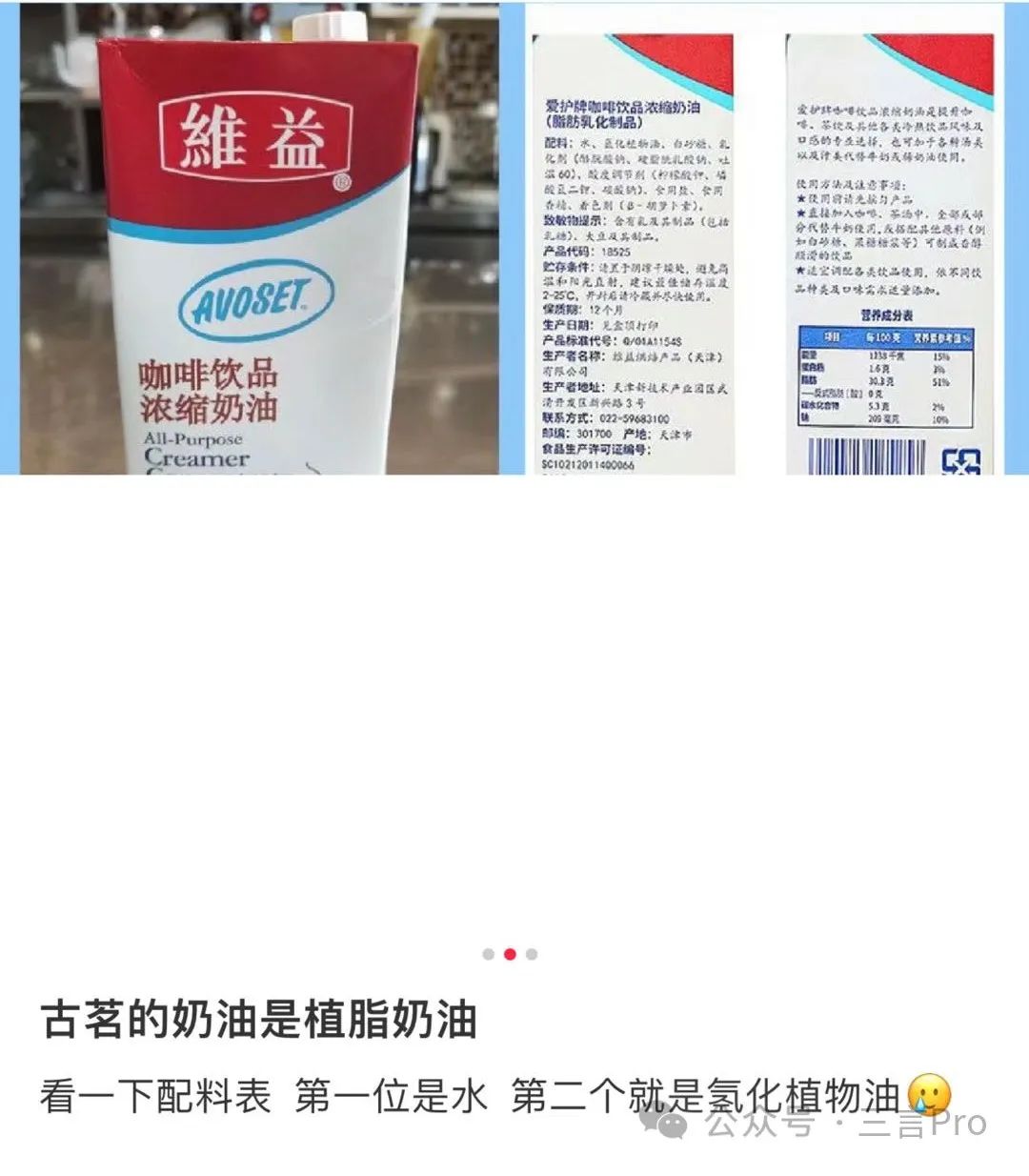 有網(wǎng)友稱,古茗的奶油配料表,第一位是水,第二位是氫化植物油。