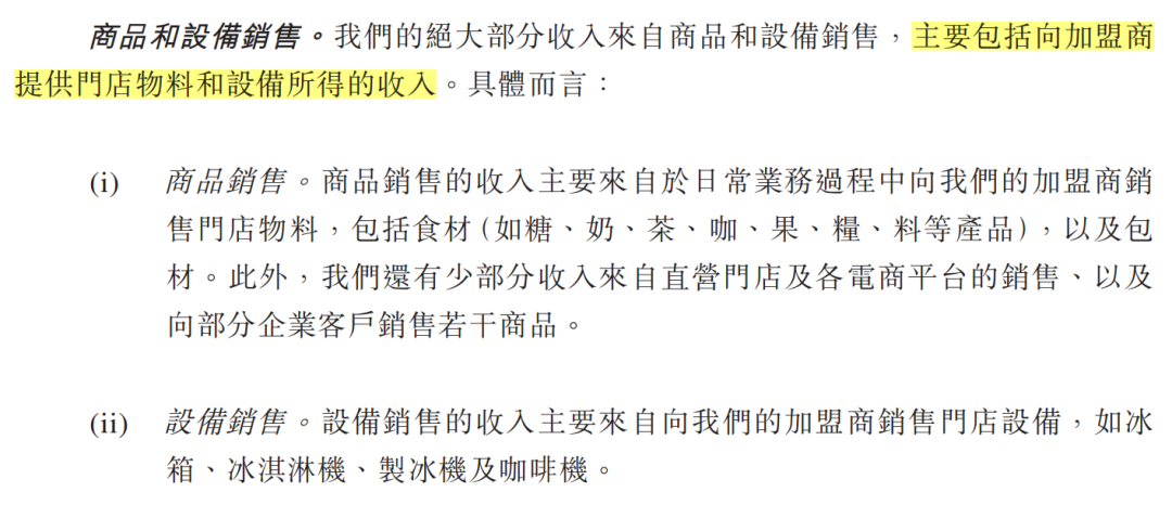 蜜雪冰城雖然側(cè)面否認(rèn)了其利用原物料及供應(yīng)鏈掙錢(qián)的“生財(cái)之道”,但其收入明細(xì)中的大頭——商品銷(xiāo)售,依然囊括了向加盟商門(mén)店提供“門(mén)店物料”一項(xiàng)。