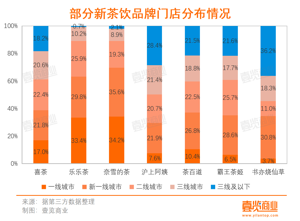 首先,壹覽商業(yè)統(tǒng)計了包括喜茶在內(nèi)的7個新茶飲品牌在不同層級城市的門店分布發(fā)現(xiàn):