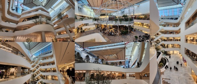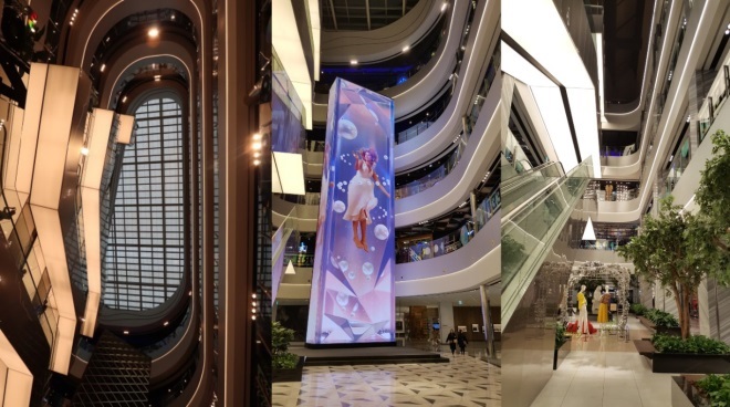 百貨空間的一部分采用了購物中心的摩爾型VOID中空和動線及采光頂,相比于原本傳統(tǒng)百貨室內悶悶不樂的空間,提高了開放性和舒適感,成為不只為購買商品而訪問的地方,而是日常生活中可以享受的空間,在中庭安裝了超高畫質LED,利用POP-UP店和活動空間,賦予時刻變化的空間感覺,還有部分空間提供綠色植物造成的舒適休息空間。