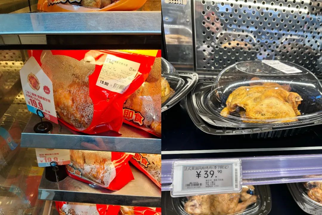 熱銷單品烤雞也有顯著的價格差異,奧樂齊的整只法式黃油風味烤雞為39.9元,盒馬奧萊的整只招牌奧爾良大烤雞為19.9元。