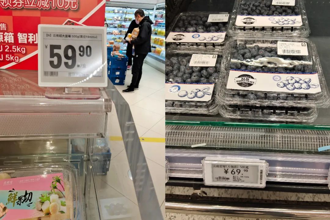 以作者剛進入奧樂齊北外灘來福士店看到的一款500克的云南超大藍莓為例,該商品售價為69.9元一盒,但在盒馬奧萊遠洋星帆廣場店,同款商品為59.9元。