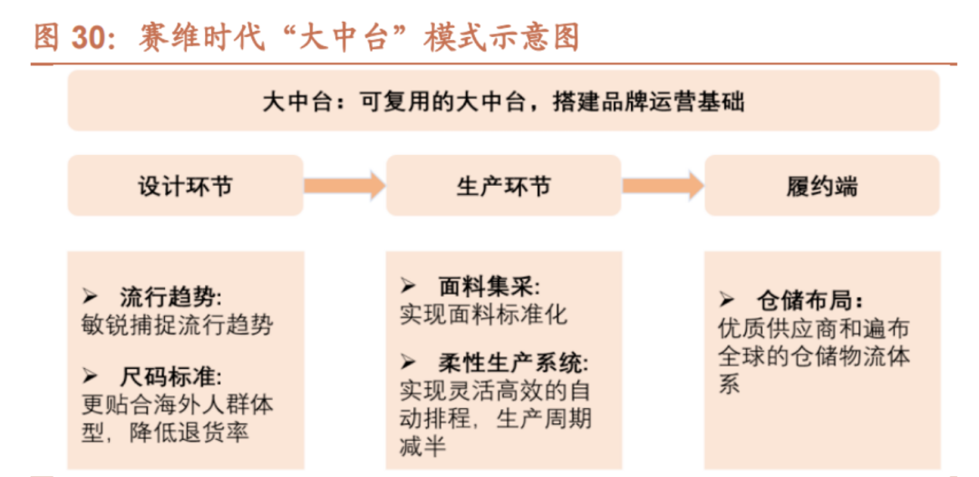 生產(chǎn)環(huán)節(jié)的柔性供應(yīng)鏈在內(nèi),通過整合共享資源,公司在內(nèi)部搭建起了涵蓋供應(yīng)鏈管理、物流、倉儲、財務(wù)、人力資源、IT部門在內(nèi)的“大中臺”,這種大中臺擁有高復(fù)用、高執(zhí)行、高效率的屬性,成為公司高層行使管控調(diào)度權(quán)力的載體,將前臺銷售和后臺策劃有機結(jié)合。