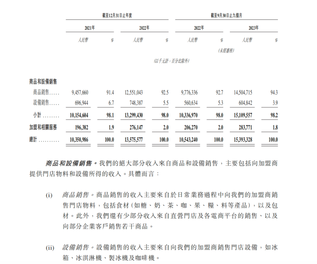 招股書顯示,以2023年前9個(gè)月為例來看,蜜雪冰城在加盟和相關(guān)服務(wù)收入方面不到3億元,占總收入的比重不到2%;向加盟商銷售的門店物料和設(shè)備銷售收入占比在98%左右,高于古茗的80%與茶百道的95%。