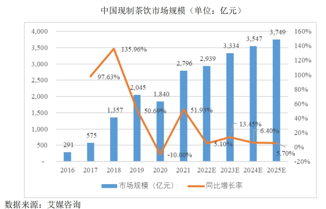 而隨著市場(chǎng)漸趨飽和,新茶飲行業(yè)將延續(xù)增長(zhǎng)放緩趨勢(shì);據(jù)艾媒咨詢預(yù)測(cè),2023年至2025年,中國(guó)現(xiàn)制茶飲市場(chǎng)規(guī)模增速分別為13.4%、6.4%、5.7%。