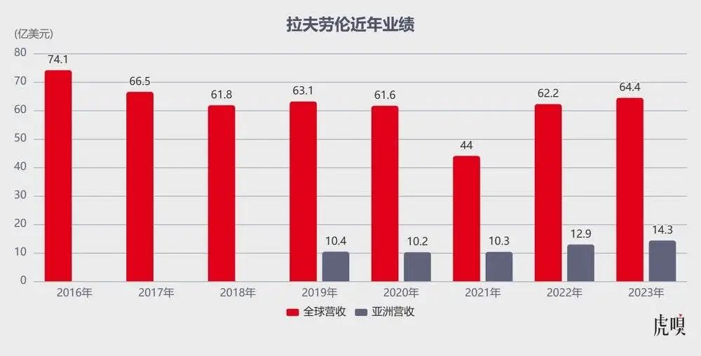 2016財(cái)年開始,拉夫勞倫在老家美國(guó)的生意就遇到了瓶頸,其全球營(yíng)收規(guī)模也漸漸萎縮,而亞洲市場(chǎng)卻在悄悄發(fā)力。2019財(cái)年到2023財(cái)年,亞洲市場(chǎng)營(yíng)收占總營(yíng)收的比重從16.6%增長(zhǎng)到了22.2%。