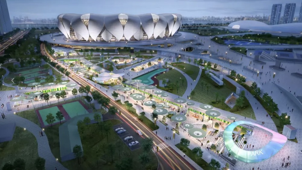 杭州奧體中心商業(yè),主要位于主場(chǎng)館(大蓮花)外圍,東南出入口至信達(dá)中心一段。根據(jù)設(shè)計(jì)方案,銀泰百貨商業(yè)部分被命名為蓮環(huán)廣場(chǎng),以蓮葉的經(jīng)脈、弧度為主要設(shè)計(jì)語(yǔ)言。宛如奧體大蓮花下延伸出的蓮葉。
