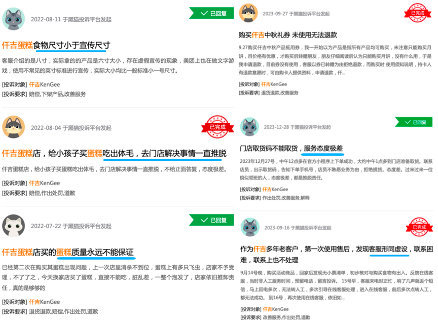 此外,在黑貓投訴平臺上,也有消費者對仟吉的產品宣傳、食品安全及質量、客戶服務等問題進行投訴。