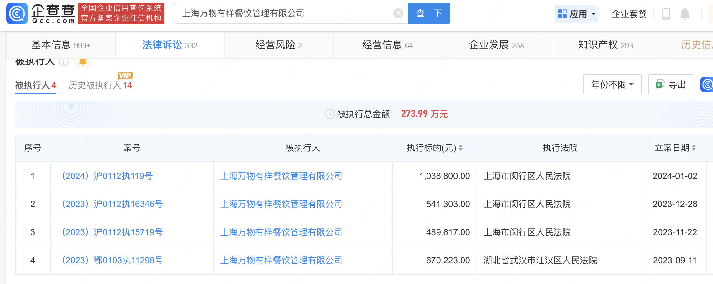 聯(lián)商快訊:近日,企查查信息顯示,新中式糕點品牌虎頭局渣打餅行母公司上海萬物有樣餐飲管理有限公司及其子公司上海胡飽飽貿(mào)易有限公司,新增一則被執(zhí)行人信息,執(zhí)行標(biāo)的103.88萬元,涉及買賣合同糾紛案件,執(zhí)行法院為上海市閔行區(qū)人民法院。