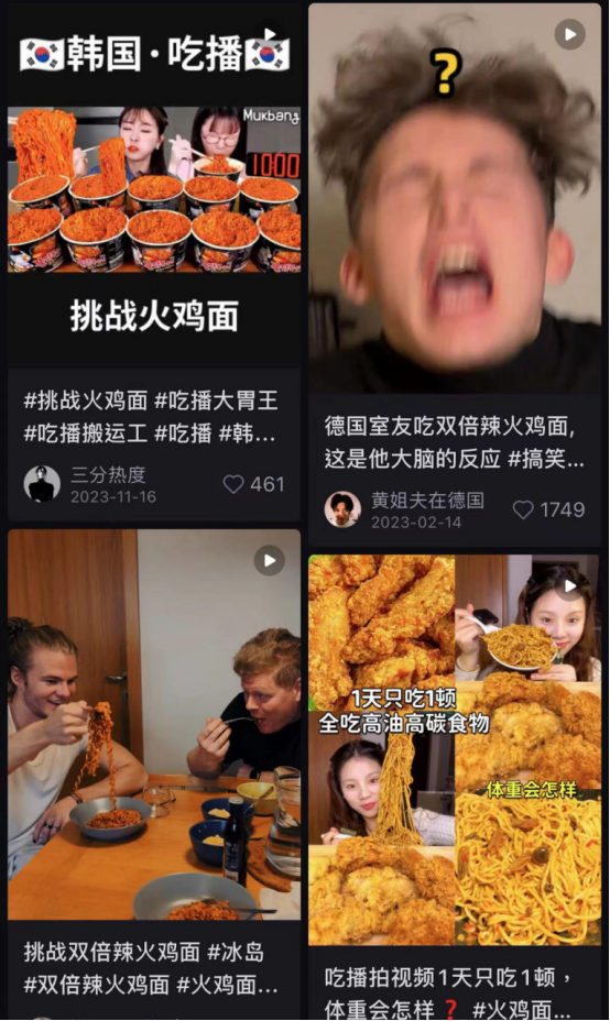 三養(yǎng)火雞面在東南亞地區(qū)上架時,曾創(chuàng)造了一股“辣哭挑戰(zhàn)”的韓流,用戶們紛紛在社媒上發(fā)布自己吃“N倍辣”火雞面的挑戰(zhàn)視頻,一時風靡全網(wǎng)。在2017年上半年淘寶和天貓的熱銷方便面榜單上,火雞面以絕對領先優(yōu)勢位居榜首,銷量甚至超過了后九名之和。至今的美食媒體里,火雞面都是吃播們出鏡率最高的常駐菜單之一,而火雞面的挑戰(zhàn)也仍然連續(xù)至今。
