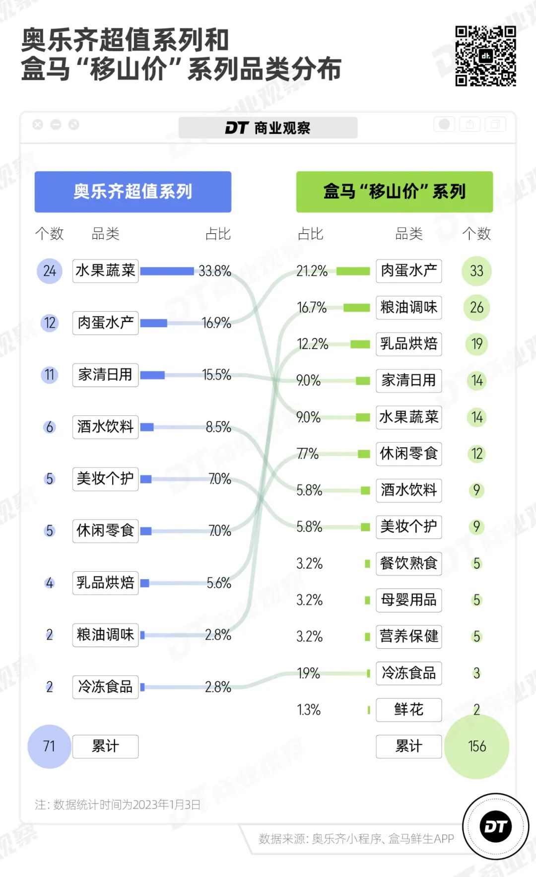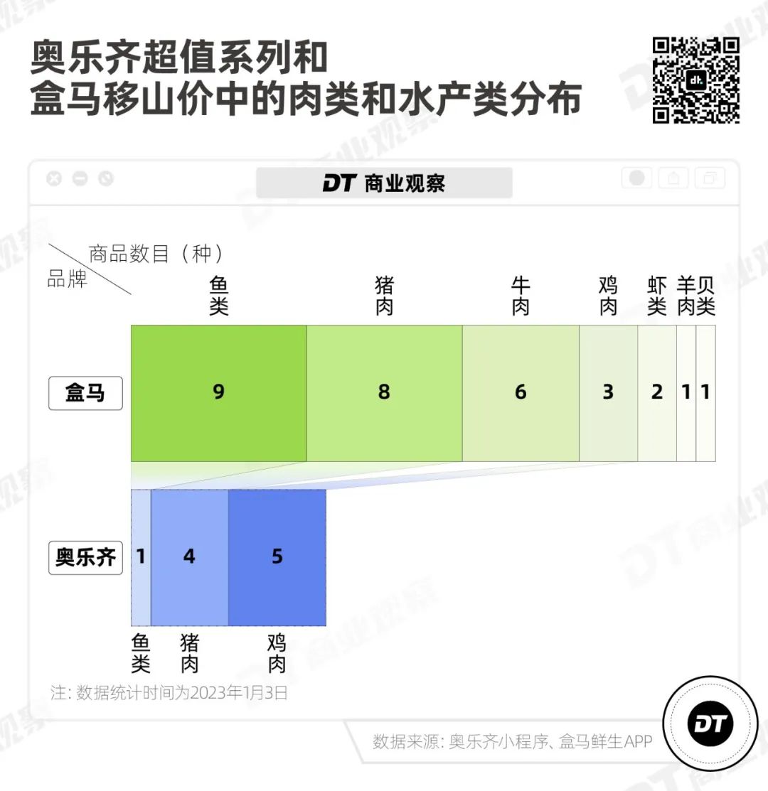 奧樂齊超值系列的71款商品,總共覆蓋了9個品類,其中一半都是生鮮(水果蔬菜+肉蛋水產(chǎn)),而盒馬“移山價(jià)”系列則包含了13個品類,比奧樂齊多了熟食、母嬰用品、保健品以及鮮花。