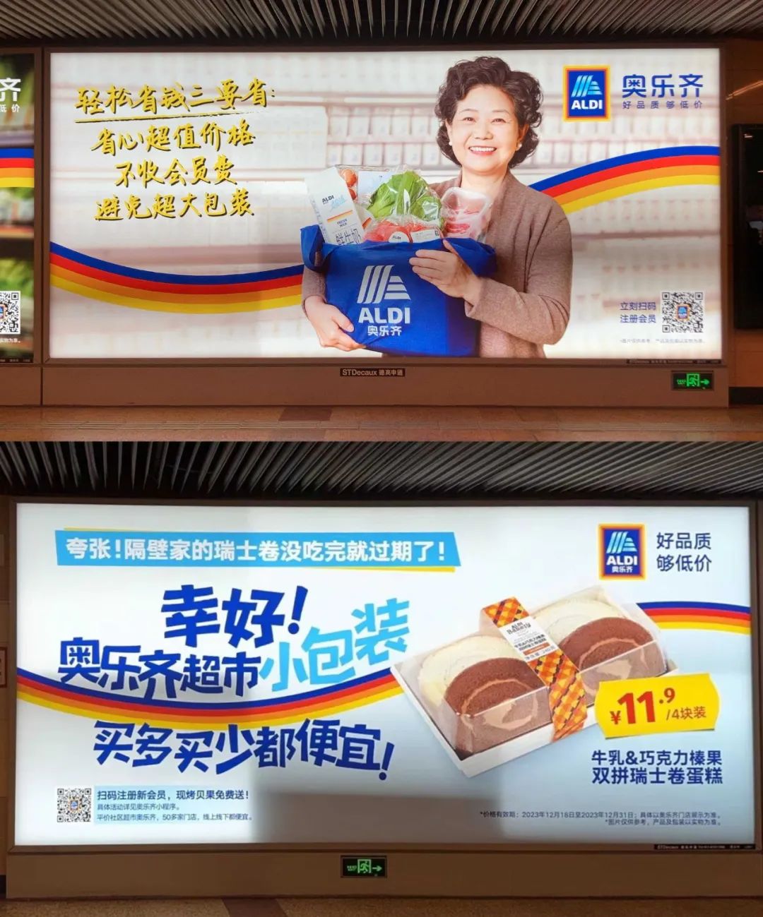 從圖中可以看到,奧樂齊目前先后在上海靜安寺地鐵站投放了兩版廣告(目前奧樂齊僅在上海有門店),第一版內(nèi)容直接貼著山姆、盒馬的網(wǎng)紅產(chǎn)品來打——