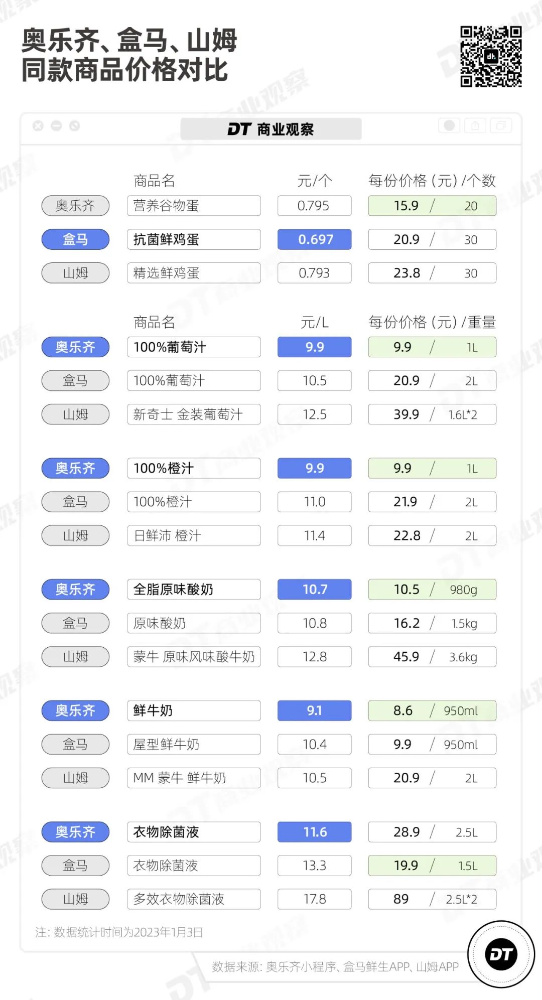 《DT商業(yè)觀察》對比了奧樂齊超值系列的71款商品、盒馬“移山”156款商品,并把山姆的同款或相似的商品作為對照,有如下發(fā)現(xiàn),并在每一點(diǎn)發(fā)現(xiàn)下面,做了一些分析。