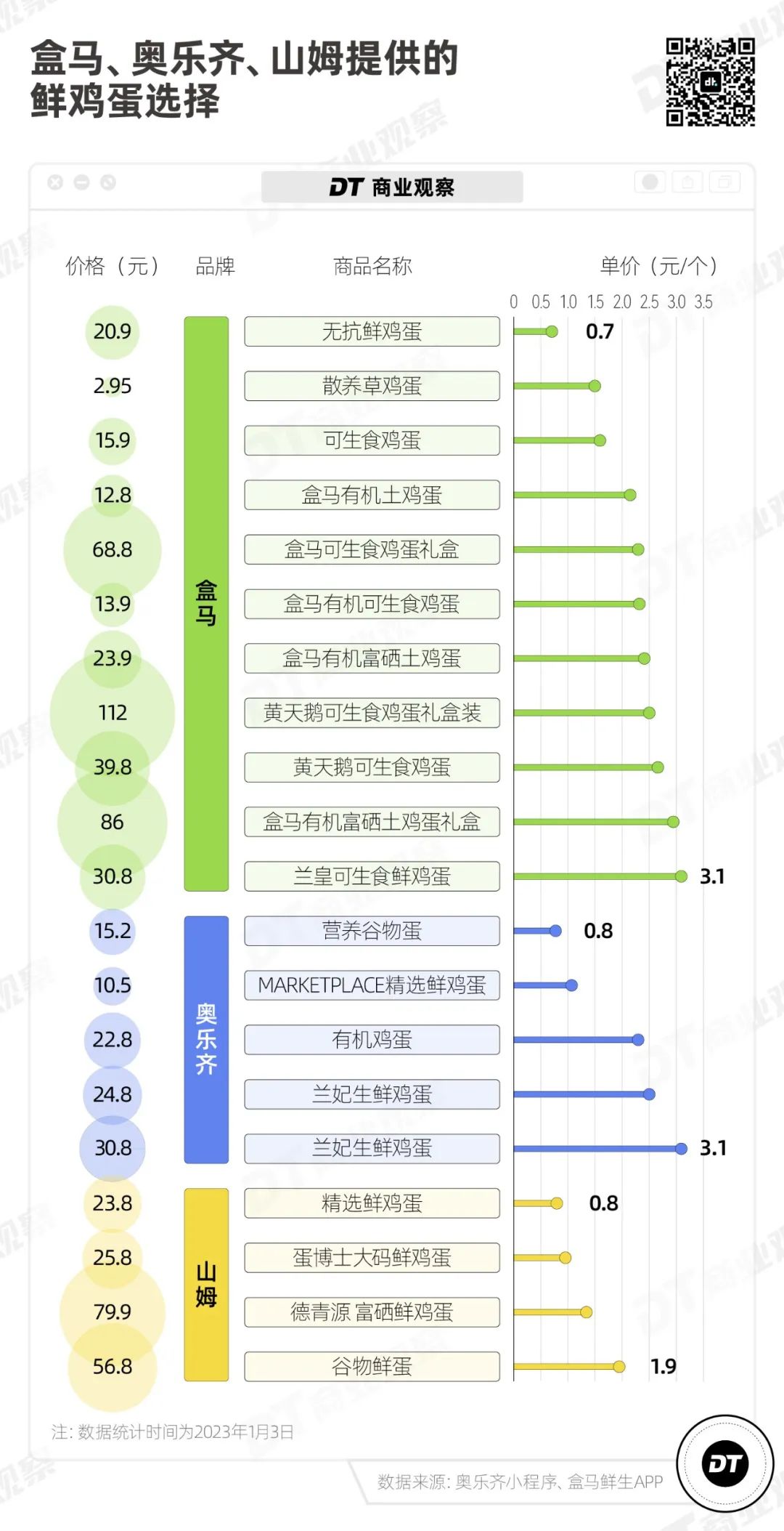 以鮮雞蛋為例,盒馬累計(jì)提供了10個SKU,包括移山價(jià)的“無抗鮮雞蛋”,單價(jià)從0.7元到3.1元不等,品類從鮮雞蛋、草雞蛋、土雞蛋到可生食雞蛋一樣俱全,既有2個裝的小包裝,也有45個裝的禮盒裝。
