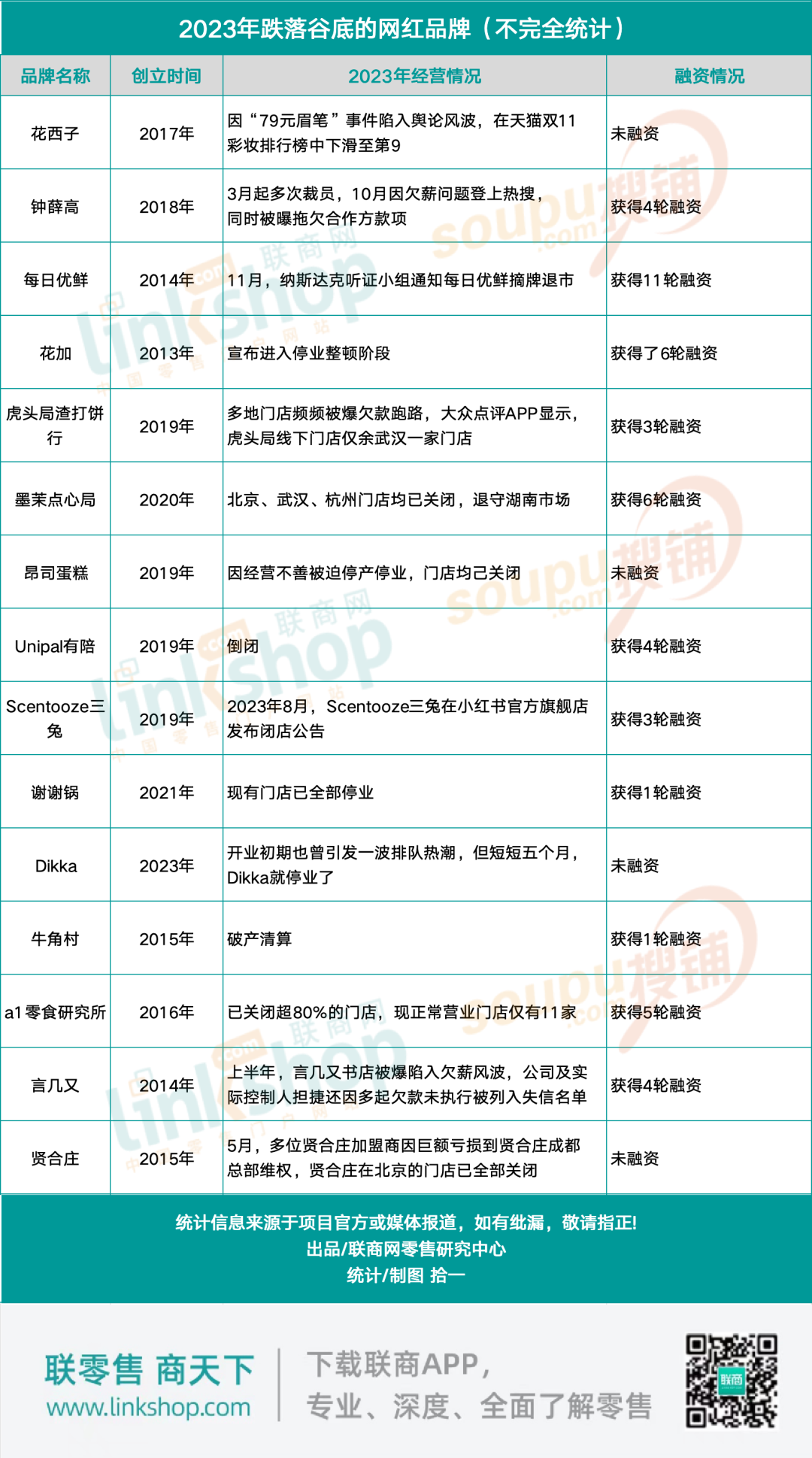 附2023年跌落谷底的主要網(wǎng)紅品牌