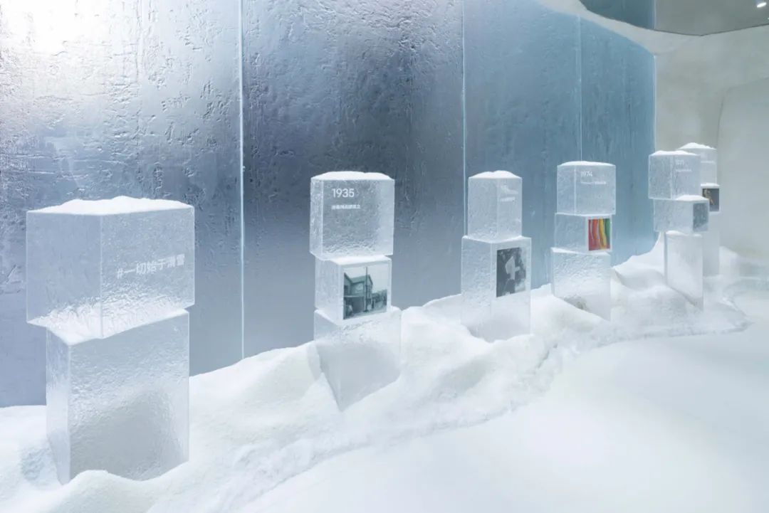 「空間」外,不同造型的雪花構(gòu)成了「空間墻」,「空間內(nèi)」展示的則是迪桑特的「品牌歷史」與「科技」,在歷史墻上,迪桑特的里程碑時(shí)刻的印記被冰塊包裹著,這也意味著迪桑特品牌發(fā)展的榮耀時(shí)刻與「冰雪」相關(guān),冰雪科技互動(dòng)裝置的展現(xiàn)也讓顧客了解到迪桑特的「科技實(shí)力」,夯實(shí)在顧客心中「最佳選擇」形象。