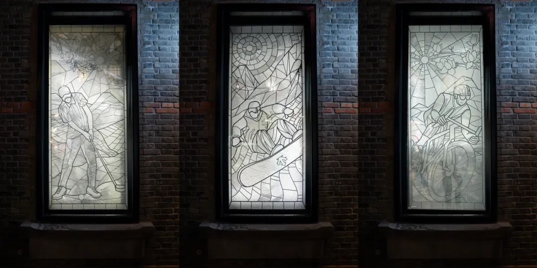 這樣的匠心在窗花設(shè)計(jì)上可以窺見(jiàn),門店窗戶上的玻璃留著傳統(tǒng)制作工藝的痕跡,窗花圖案的靈感源自迪桑特滑雪、高爾夫、鐵人三項(xiàng)三大專業(yè)運(yùn)動(dòng),將海派風(fēng)格與品牌基因創(chuàng)意結(jié)合,又直觀展示了品牌「多元」產(chǎn)品線,告訴顧客迪桑特「始于滑雪」,但不止于滑雪。