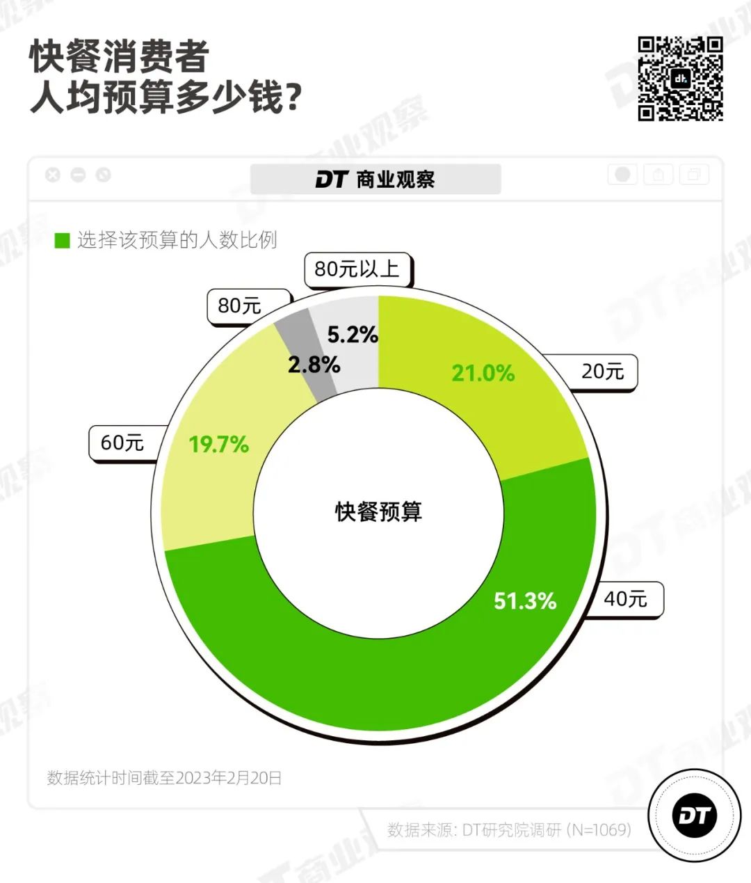 《DT商業(yè)觀察》的《快餐小調(diào)研》同時發(fā)現(xiàn),如今消費(fèi)者吃快餐的預(yù)算,也在逐漸向正餐看齊:超五成人的快餐預(yù)算達(dá)到40元,而預(yù)算60元和預(yù)算20元的快餐消費(fèi)者,分別占比2成。
