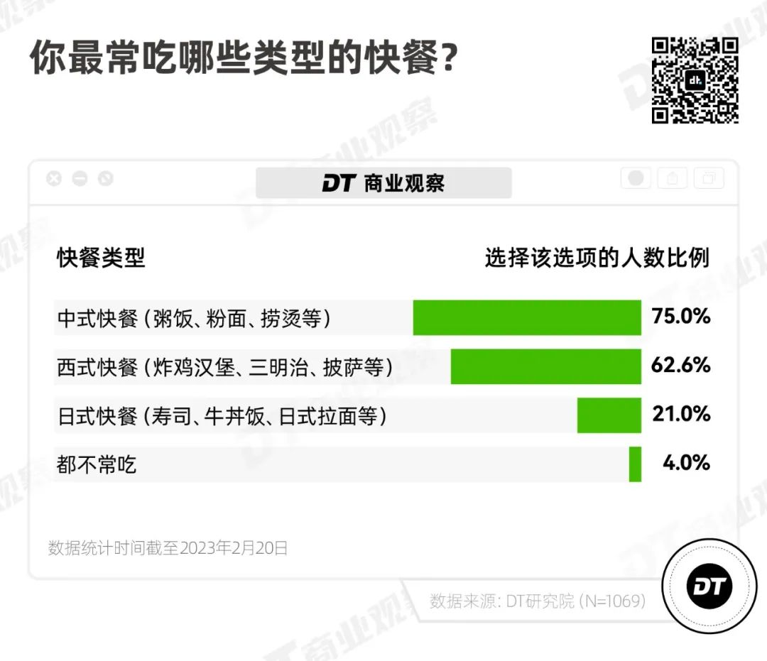 根據(jù)《DT商業(yè)觀察》2023年2月發(fā)布的《快餐小調(diào)研》:超半數(shù)人一周要吃好幾次快餐,快餐正在成為不少人的“剛需消費(fèi)”。