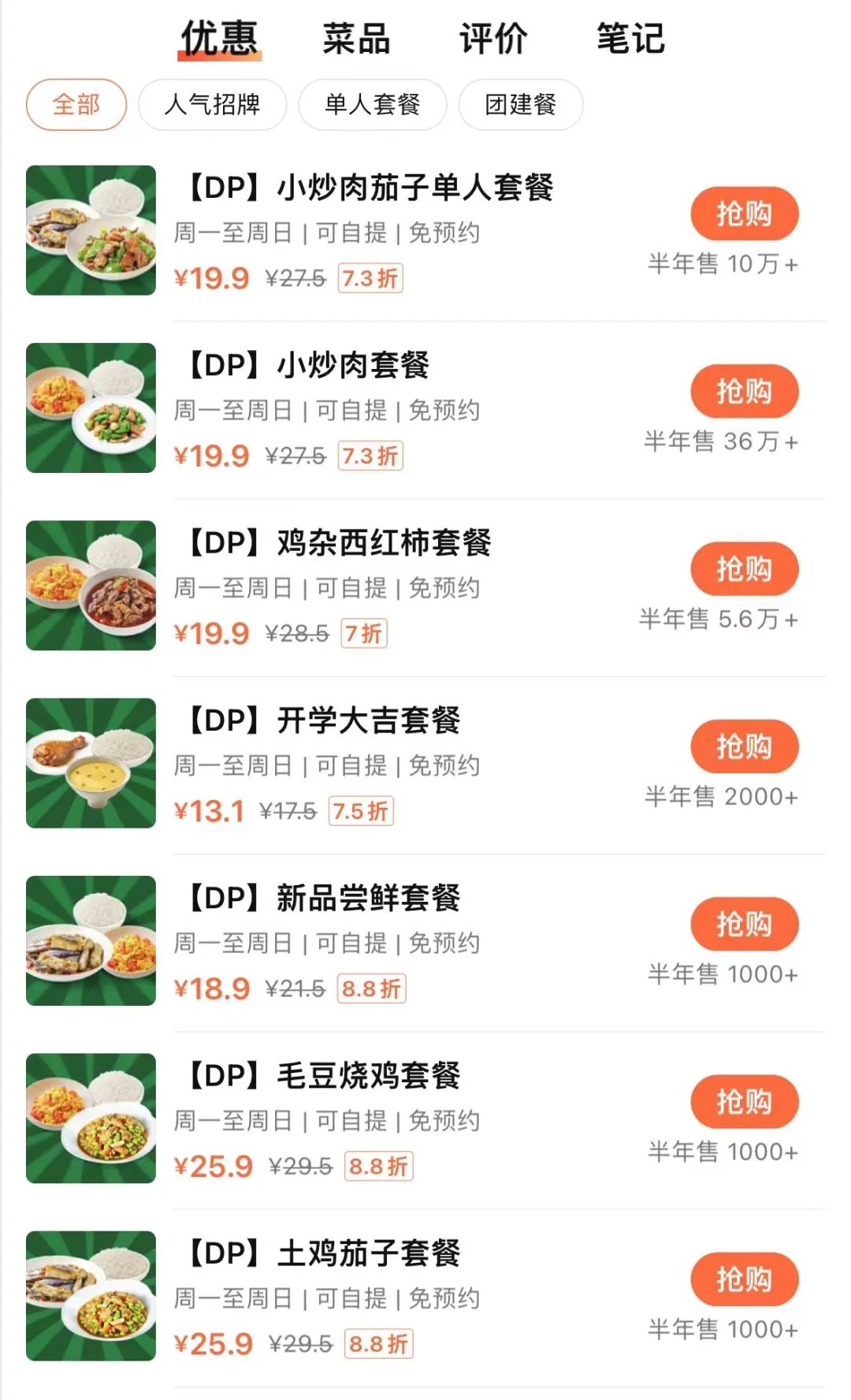 而在線下場景,老鄉(xiāng)雞則在本地生活服務(wù)平臺上線了超過10種,主要以“2菜一飯“為配置的團(tuán)購套餐。以上海地區(qū)為例,團(tuán)購套餐價格低至13.1元,相比線上點(diǎn)外賣更便宜。