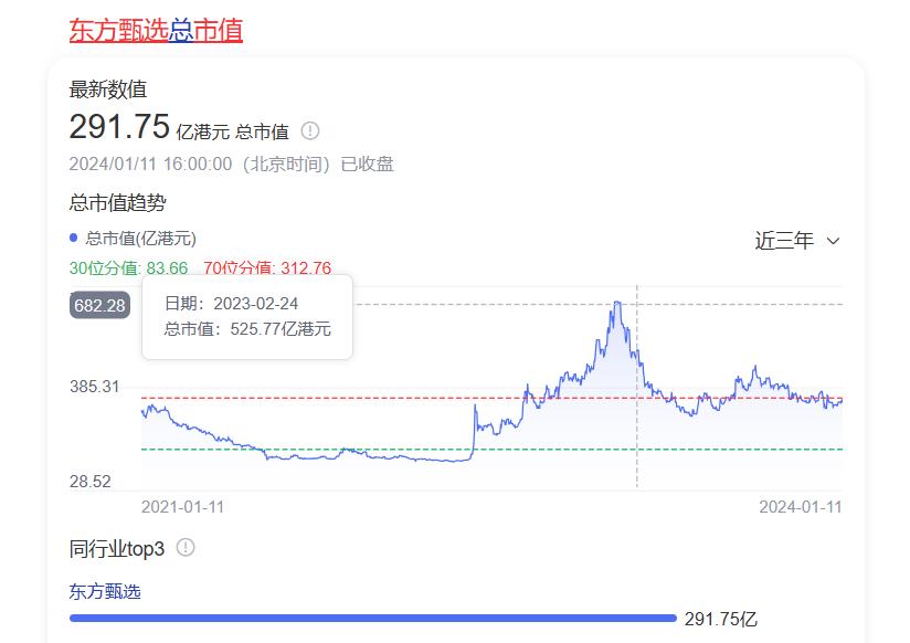 當初“小作文”事件罵聲最盛時,東方甄選一日市值蒸發(fā)40億港元,總市值276.08億港元。但截至發(fā)稿,東方甄選市值回到了291.75億港元,股價漲幅一度高達15.43%,不少專業(yè)人士表示其市值有望重回300億港元大關。