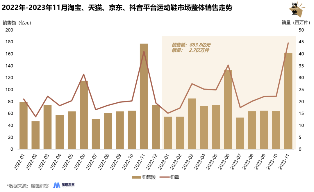 22年-23年11月淘寶、天貓、京東、抖音運(yùn)動(dòng)鞋市場(chǎng)銷售走勢(shì)