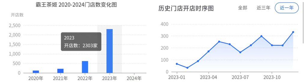 截至2024年1月4日,霸王茶姬共有3200家門店,2023年新開門店數(shù)量為2303家,開店數(shù)同比增長271%。