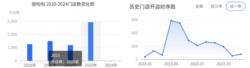 截至2024年1月4日,甜啦啦共有5789家門店,2023年新開門店數(shù)量為2925家,開店數(shù)同比增長148%。
