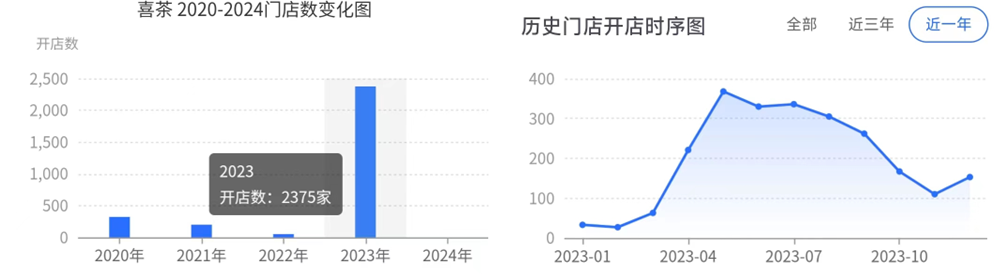 截至2024年1月3日,喜茶共有3179家門店,2023年新開門店數(shù)量為2375家,看到2020年/2021年/2022年的322家/199家/51家,23年的開店數(shù)是前三年數(shù)量總和的4倍有余。