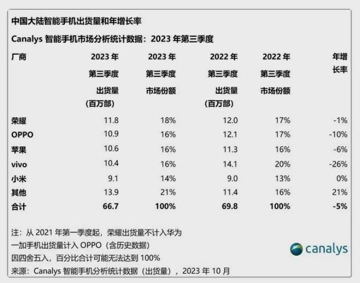 根據(jù)市場研究機構(gòu)Canalys公布的數(shù)據(jù),2023年一季度榮耀手機在中國大陸出貨量同比從2022年的1500萬臺降到了970萬臺,跌幅35%,市場份額落到了第四位;二季度榮耀出貨量與2022年同比再度下降了21%,以1030萬臺繼續(xù)排名第四。兩個季度連續(xù)35%、21%的同比降幅,不僅遠(yuǎn)超同期中國智能手機市場出貨量11%、5%的下滑幅度,也高于小米、OPPO、VIVO的同期降幅。