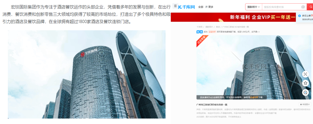 但在相關報道中,宏琰國際集團的配圖似乎存在問題。在報道中,其配圖經(jīng)過PS處理,所出現(xiàn)的圖片并非是“宏琰國際集團”的總部大樓,而是廣東珠江新城的雅居樂中心。原始素材可以在圖庫網(wǎng)站中購買。