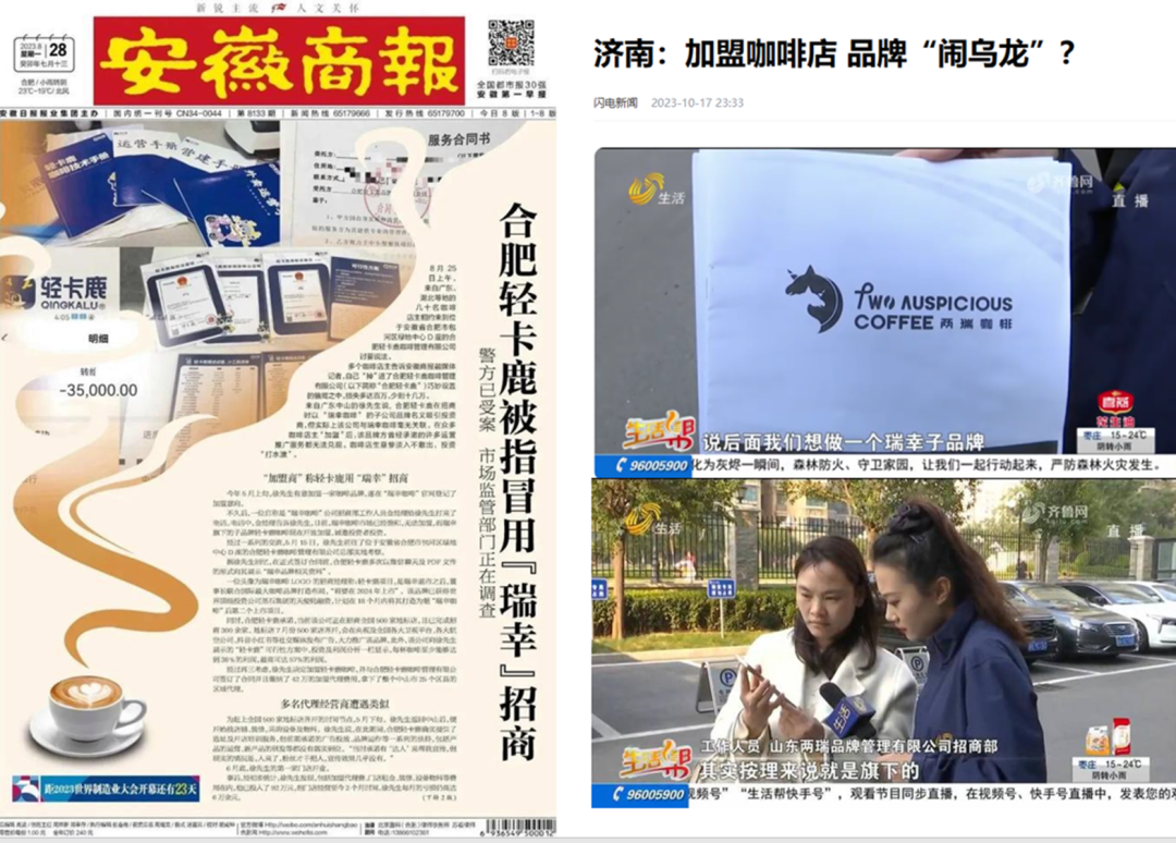 10月份兩瑞咖啡被山東電視臺生活幫節(jié)目的報道顯示,山東兩瑞品牌管理有限公司被爆出假冒瑞幸旗下子品牌招商,相關部門表示會介入調(diào)查。