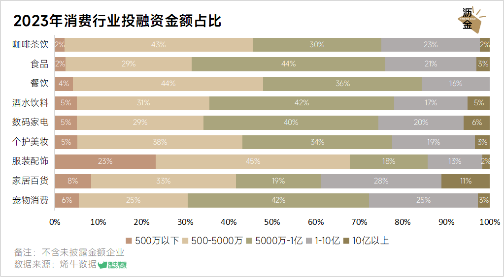 消費(fèi)行業(yè)企業(yè)投融資金額仍多數(shù)集中于500-5000萬(wàn)元人民幣區(qū)間。