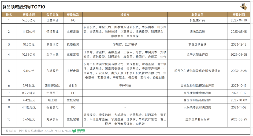2023上半年,食品的巨額融資主要集中在調(diào)味品和食用油等供應(yīng)鏈企業(yè),其中,中糧福臨門(mén)拿到了全年最高的一筆投資;