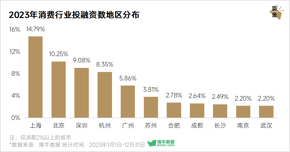 從地域分布來(lái)看,消費(fèi)行業(yè)投融資事件主要集中在一線(xiàn)和新一線(xiàn)城市,上海、北京、深圳、杭州所獲融資數(shù)合計(jì)占比超四成,但較2022年有所下降。