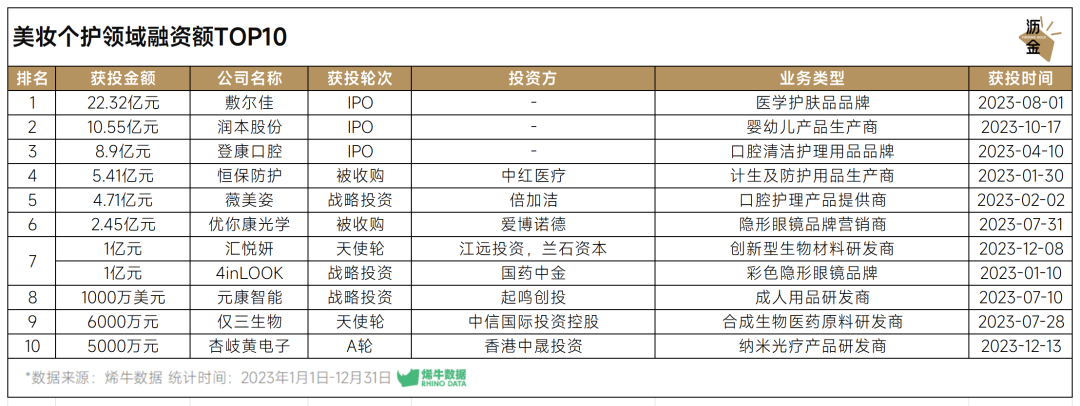 美妝個(gè)護(hù)領(lǐng)域融資額TOP10