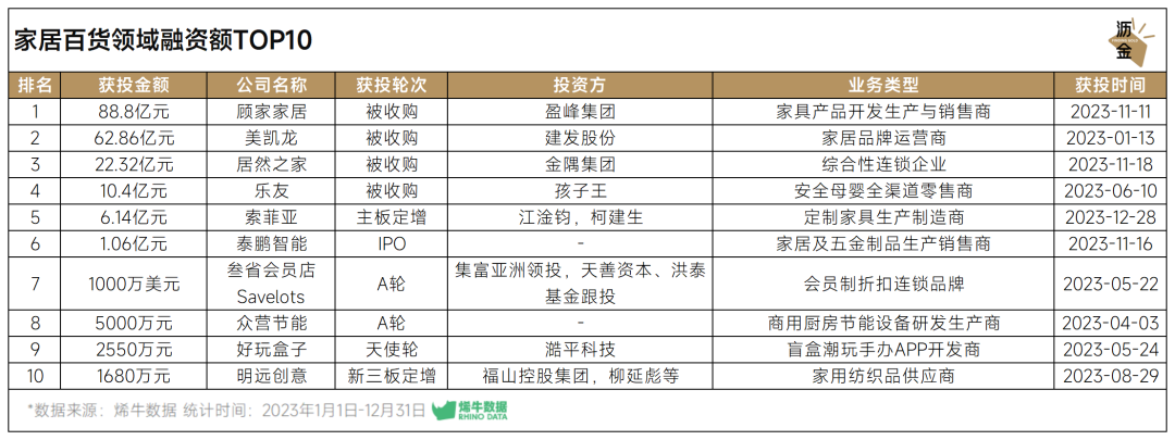 家居百貨賽道并購(gòu)潮起,去年融資額TOP10中共有4家企業(yè)被收購(gòu),分別是做顧家家居、美凱龍、居然之家和做母嬰全渠道零售的樂(lè)友。