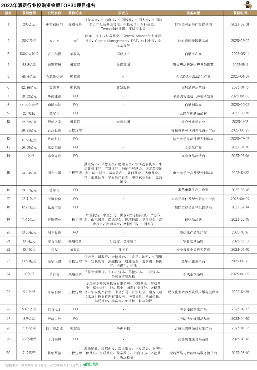 2023年消費(fèi)行業(yè)投融資金額TOP30項(xiàng)目排名