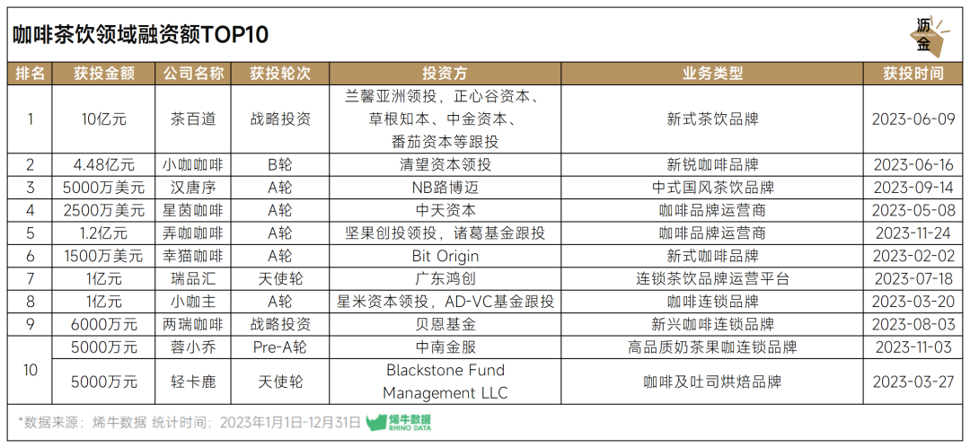 2023年的咖啡融資仍未熄火,在咖啡茶飲領(lǐng)域融資額TOP10里占比過(guò)半,且咖啡品牌在不斷做加法,果咖、茶咖、咖啡 烘焙等融合其他元素的品牌易拿到投資。而茶飲賽道中,新式茶飲品牌“茶百道”以10億元大額戰(zhàn)略投資位居榜首。
