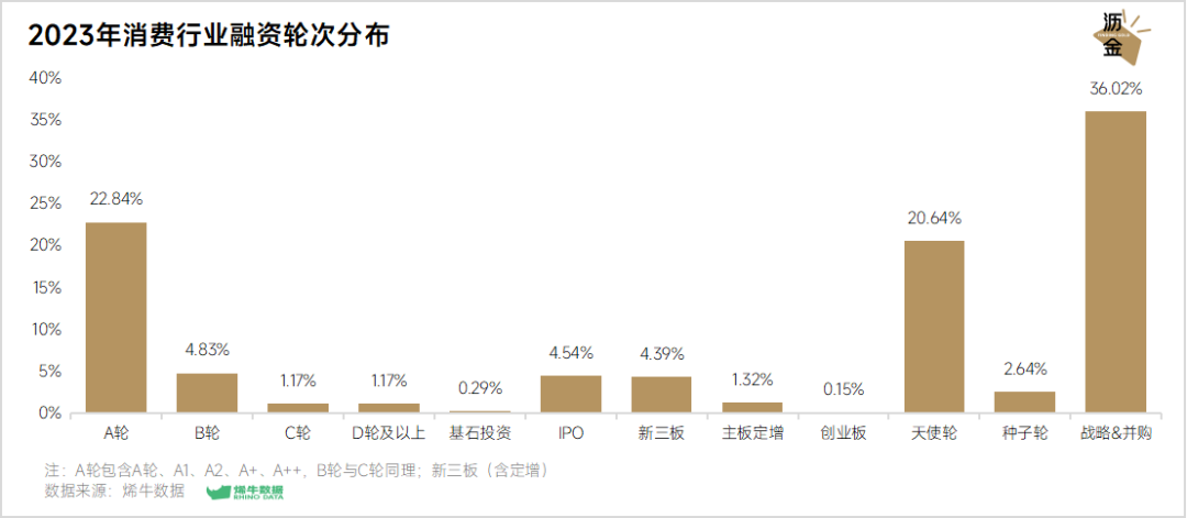 而天使輪、A輪融資合計(jì)占比超過(guò)40%,說(shuō)明投資人、機(jī)構(gòu)對(duì)消費(fèi)領(lǐng)域的許多早期項(xiàng)目仍有信心,看好企業(yè)因新興市場(chǎng)、創(chuàng)新產(chǎn)品或服務(wù)帶來(lái)的高增長(zhǎng)潛力。