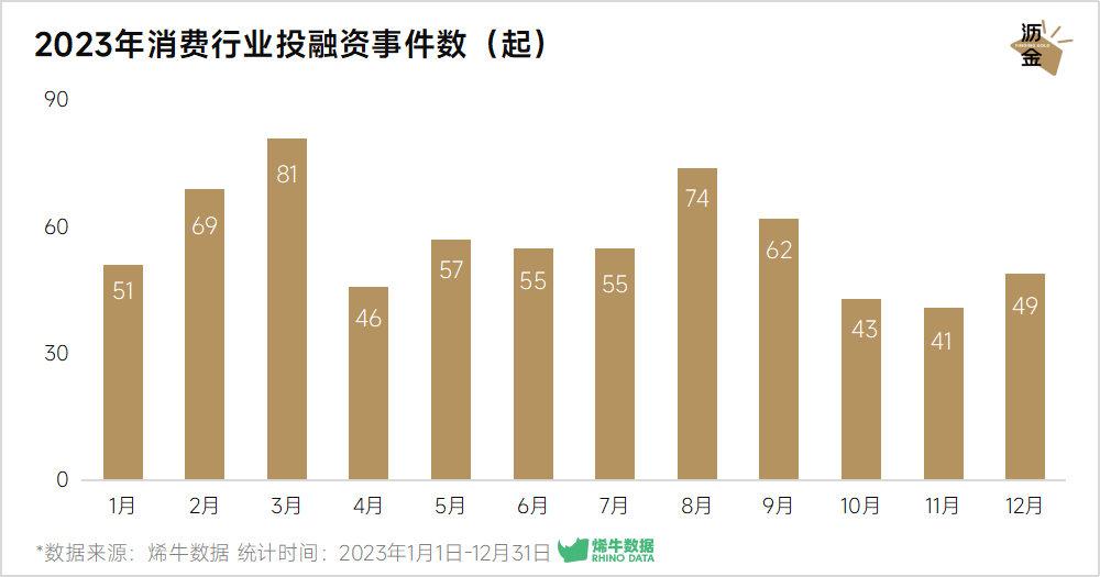 逐月看投融資事件數(shù),可以發(fā)現(xiàn)疫情全面放開(kāi)后,第一季度的消費(fèi)行業(yè)投融資事件逐漸增加,到3月達(dá)到全年頂峰81起。