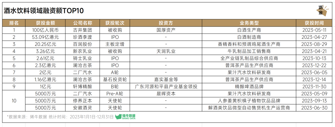 在酒水飲料領(lǐng)域融資額TOP10中,僅有3起融資為酒類(lèi)企業(yè),投資輪次大多集中在茶水果汁。